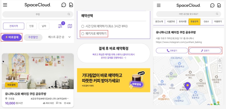 스페이스클라우드의 많은 공간을 당일 예약해 바로 이용할 수 있어요. ‘바로결제’가 가능한 공간을 검색해 예약하세요. 호스트의 승인을 기다리지 않아도 되고, 결제와 동시에 예약이 확정되기 때문에 더욱 편리해요. 3시간 전에만 예약한다면 시간 단위로 판매되는 공간에서 바로결제 유형을 사용하는 경우 당일 예약이 가능해요.