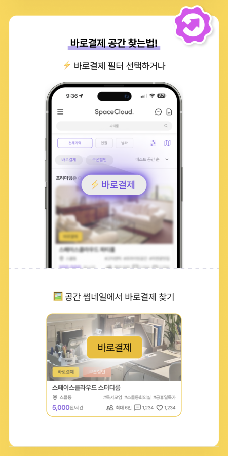 기다리지 않아 더 편한 ‘바로결제’공간 선정부터 예약 확정까지 빠르게 완료할 수 있는 바로결제를 이용해 보세요. 호스트님의 승인을 기다리지 않고 예약할 수 있어, 빠르게 일정을 확정짓고 계획을 세우고 싶어하는 사람과 즉흥적으로 공간을 이용하고 싶은 사람 모두에게 유용한 예약 방법입니다.