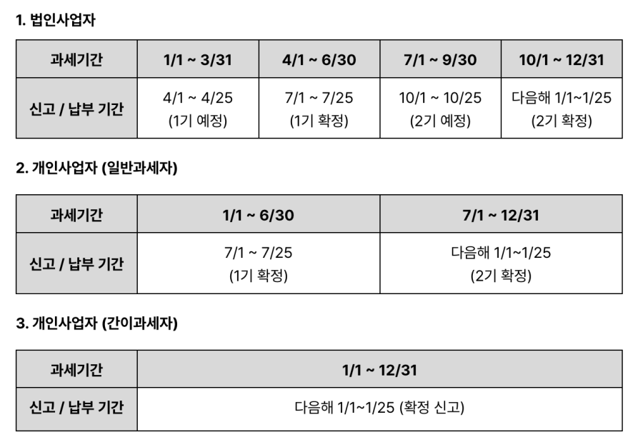 부가세 신고 기간은 사업자 유형별로 달라요. 법인사업자, 개인사업자(일반과세자), 개인사업자(간이과세자)의 신고 기간을 확인하세요.