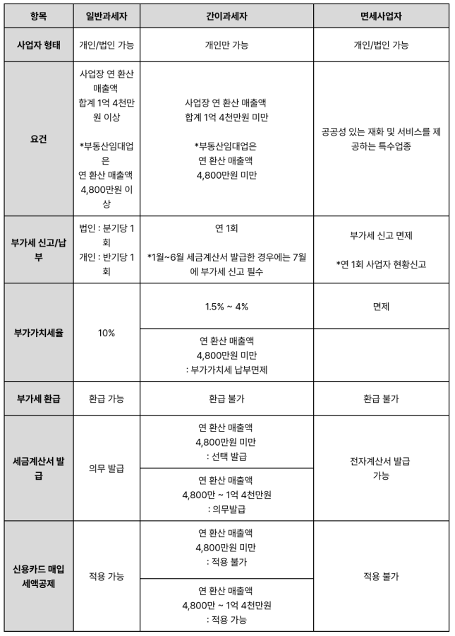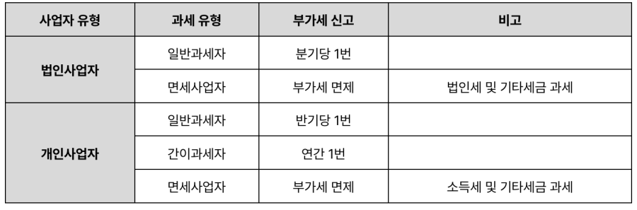 사업자별 과세 유형은 일반과세자, 면세사업자, 간이과세자로 나뉘는데요. 아래의 분류에 따라 신고 주기가 다르니 꼼꼼한 확인이 필요해요.