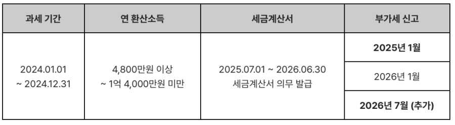 (예시: 2024년도 환산 매출이 4,800만원을 초과한 경우 2025년 7월 1일부터 2026년 6월 30일까지 세금계산서 발급 의무가 발생하며, 2024년 1월~6월에 세금계산서를 발행한 경우 2024년 7월 부가세 신고 의무 추가)