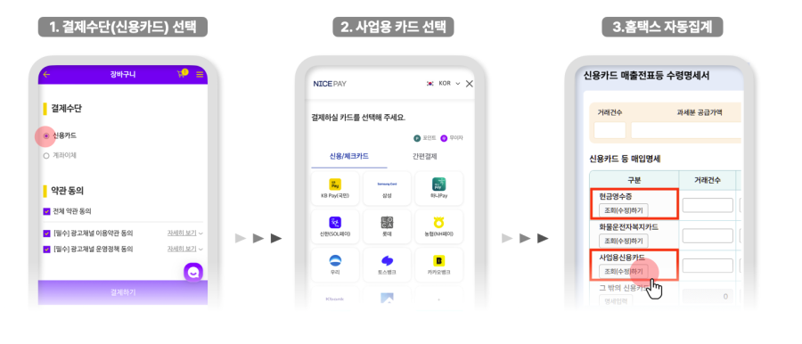 홈택스에 사업 경비 결제용으로 등록해 둔 사업용 카드로 결제하세요. 홈택스에서 자동으로 카드 내역이 자동으로 집계되어 따로 서류를 준비할 필요가 없어요. 사업용 카드에 대한 자세한 정보는 🔗 국세청 사업용 신용카드 개요에서 확인할 수 있어요.