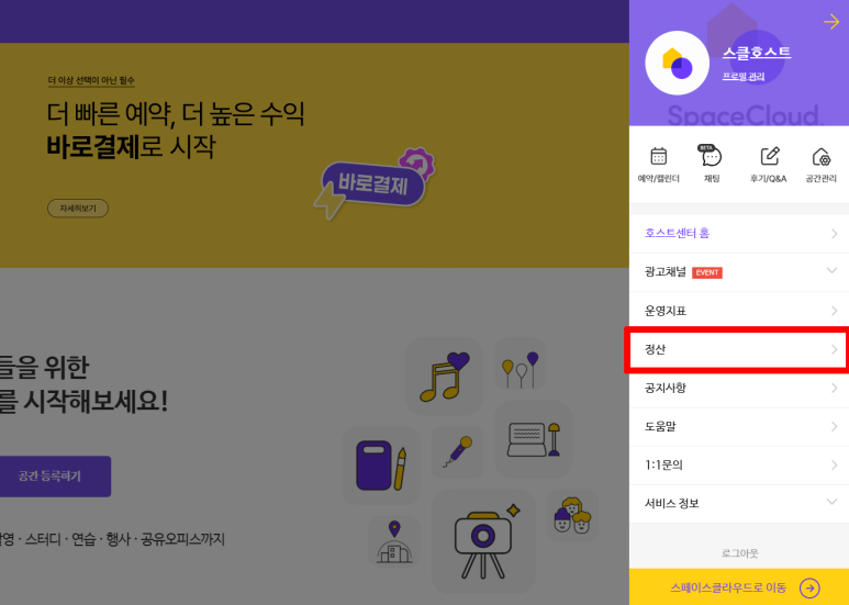 스페이스클라우드 호스트센터에 접속해 주세요. 반드시 PC 크롬 브라우저 환경에서 접속해 주셔야 합니다. 호스트센터 우측 상단 메뉴에 있는 [정산 - 정산 완료 페이지]로 들어가 주세요.