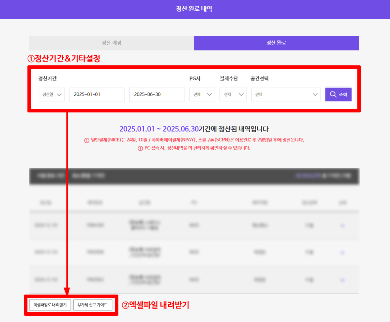 그리고 정산기간, PG사, 결제수단, 공간 등 필터를 설정해 주세요. 마지막으로 페이지 하단에 있는 [엑셀파일로 내려받기] 버튼을 눌러주시면 다운로드 받을 수 있습니다.