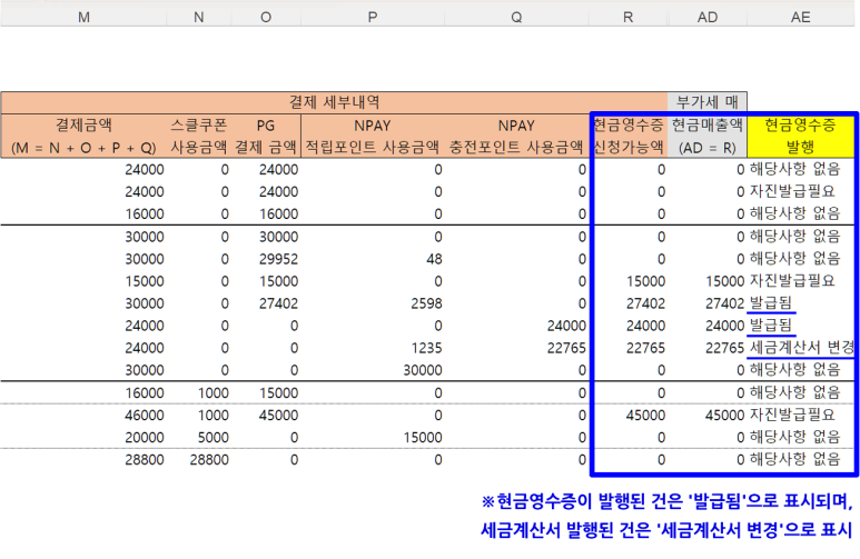 💥 현금영수증 외 세금계산서가 발행된 건은 '세금계산서 변경'으로 별도 표시됩니다.