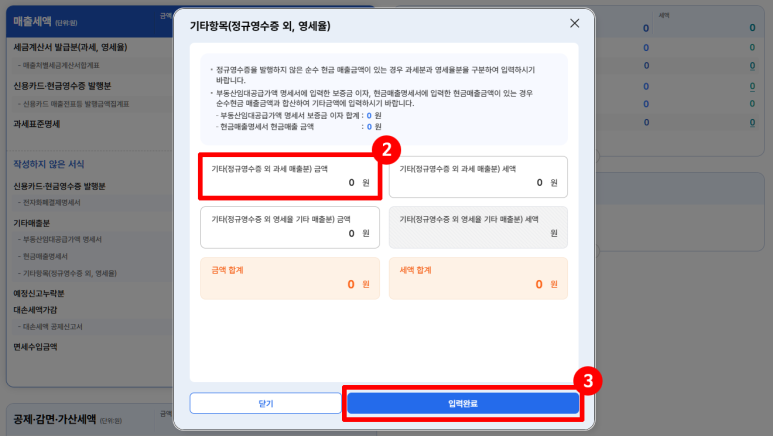 매출세액 → 작성하지 않은 서식 → 기타매출분 → 기타항목(정규영수증 외, 영세율) '입력하기' 버튼 클릭 → 카드결제 및 적립포인트 등 기타 매출에 속하는 내역 입력