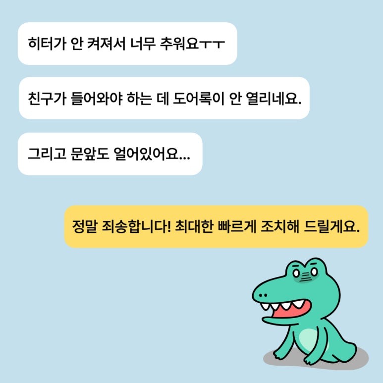 겨울철 난방, 온수 고장은 즉시 대처하기도 어렵고 게스트의 공간 이용 경험에 큰 영향을 끼칠 수 있어요. 그래서 게스트가 공간을 사용하기 전에 확인하는 것이 중요해요. 게스트가 사용방법을 몰라 작동이 되지 않는다고 오해하는 경우도 있으니 상세하게 안내해 주세요. 보일러 가동 시간이 오래 걸리는 경우 미리 담요나 작은 히터 등을 구비해 놓으면 큰 도움이 될 거예요.