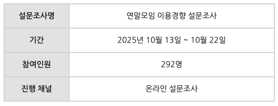 ‘연말 모임’은 이미 우리의 일상에 스며든 문화라고 할 수 있어요. 전체 응답자의 90% 이상이 연말 모임을 경험해 본 적 있다고 말했어요. 특히 친구, 동호회 중심의 사교형 모임이 주류로 자리한 것을 확인할 수 있었습니다.