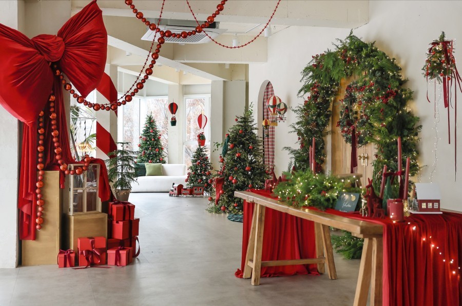 - 크리스마스: 트리, 조명, 시즌 인테리어 등과 함께 테이블과 공간이 보이는 사진