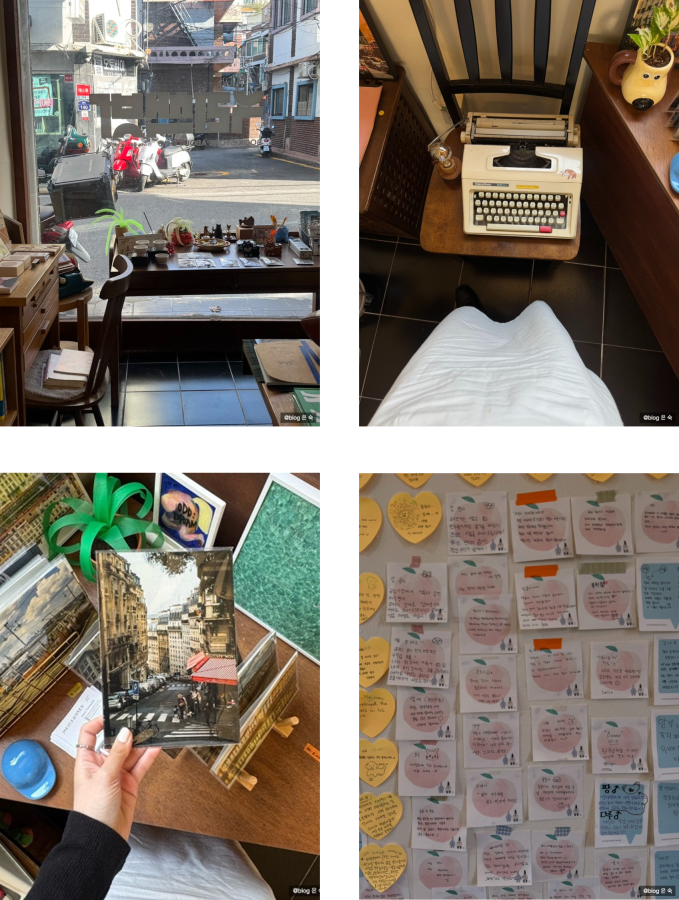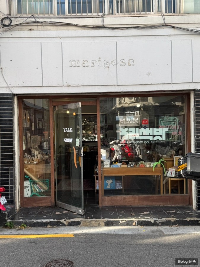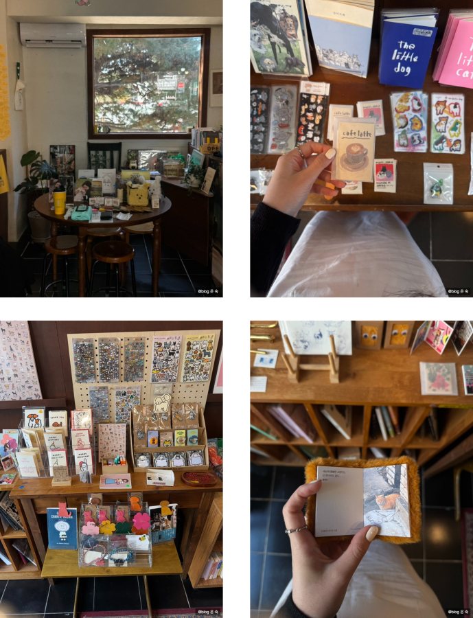 후암동 골목이 한 눈에 보이는 큰 통창 입구를 보니 강아지와 함께 연말에 이곳에 오고 싶어져요. 저는 왜 강아지가 없는 걸 까요… 사장님의 감성이 가득 담긴 우드톤의 인테리어와 소품들, 포스터와 스티커, 책과 엽서까지 다양하게 구경하기 좋았어요. 아기자기 레트로한 감성의 물건도 있었고요. 무엇보다 제 마음을 사로잡았던 건 외국 풍경의 엽서였답니다. 강아지와 관련된 물건 외에도 이런 것들이 다양하게 있어 공간을 구경하는 재미가 쏠쏠해요. 많이 넓지는 않지만 2-6인 수용 가능한 서점이라 아기자기하게 이용하기 딱 좋았어요. 포스트잇에는 이용 후기가 적혀있었고, 반려동물과 함께 모임하면서 적으신 글이 참 좋았답니다. 다들 너무 귀여우시다는 인상!